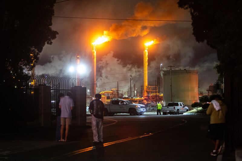 Chevron oil refinery fire EL SEGUNDO, CALIFORNIA - OCTOBER 3: People watch a fire burn at a Chevron refinery on October 3, 2025 in El Segundo, California. A big explosion around 10pm (PST) on October 02, producing a large orange blaze that could be seen from miles away from the refinery close by the Los Angeles airport. (Photo by Apu Gomes/Getty Images) (Apu Gomes/Getty Images)