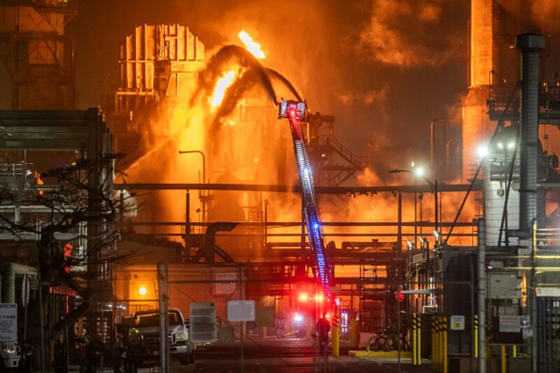 Chevron oil refinery fire EL SEGUNDO, CALIFORNIA - OCTOBER 3: Fire burns at a Chevron refinery on October 23, 2025 in El Segundo, California. A big explosion around 10pm (PST) on October 02, producing a large orange blaze that could be seen from miles away from the refinery close by the Los Angeles airport. (Photo by Apu Gomes/Getty Images) (Apu Gomes/Getty Images)